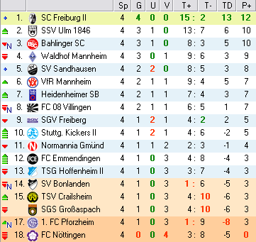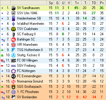 | 15. Spieltag | 4 | 3 | 2 | 27 | 17:10 | 3,00 | 0 | 1/2 | 43 | 3 | 0 | 4.632 | 515 | » Tabelle |