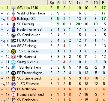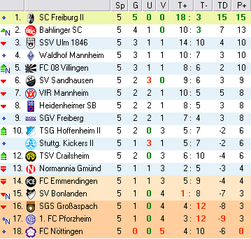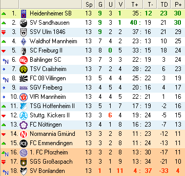 | 13. Spieltag | 5 | 1 | 3 | 24 | 15:9 | 2,67 | 0 | 3/4 | 44 | 2 | 2 | 11.650 | 1.294 | » Tabelle |