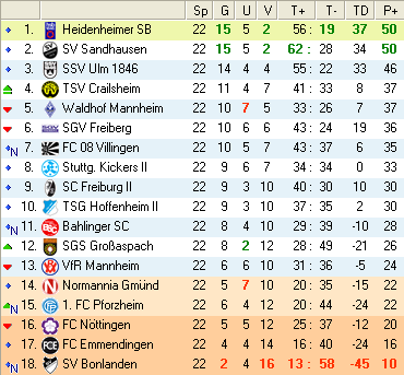 | 22. Spieltag | 2 | 3 | 4 | 16 | 6:10 | 1,78 | 0 | 3/4 | 40 | 2 | 0 | 7.494 | 833 | » Tabelle |