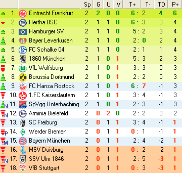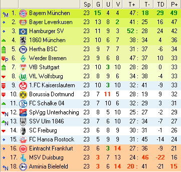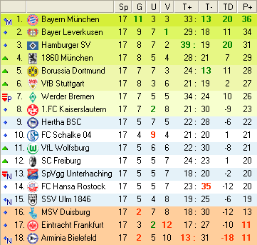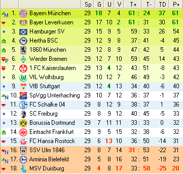 | 29. Spieltag | 3 | 3 | 3 | 23 | (13:10) | 2,56 | 0 | 3/3 | 35 | 0 | 2 | 250.538 | 27.838 | Tabelle |