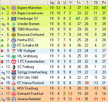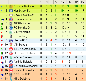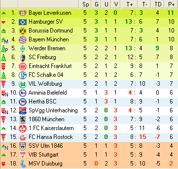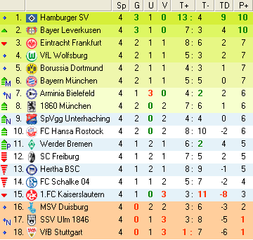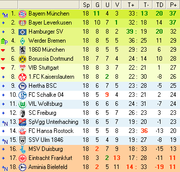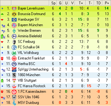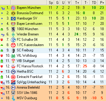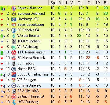 | 10. Spieltag | 3 | 5 | 1 | 18 | (12:6) | 2,00 | 0 | 4/6 | 40 | 2 | 1 | 284.285 | 31.587 | Tabelle |