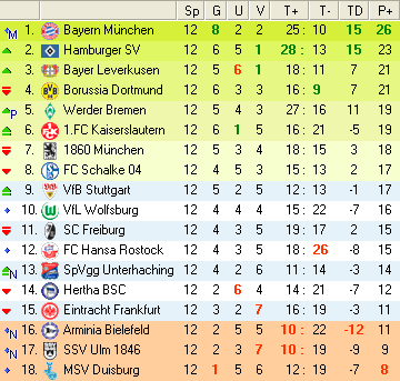 | 12. Spieltag | 6 | 2 | 1 | 27 | (22:5) | 3,00 | 0 | 1/1 | 36 | 1 | 0 | 262.437 | 29.160 | Tabelle |