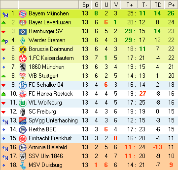 | 13. Spieltag | 2 | 3 | 4 | 23 | (10:13) | 2,56 | 1 | 1/1 | 36 | 0 | 0 | 297.833 | 33.093 | Tabelle |