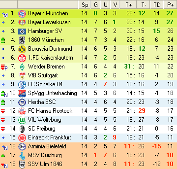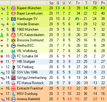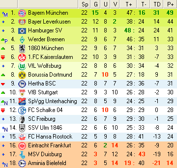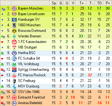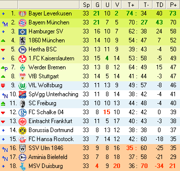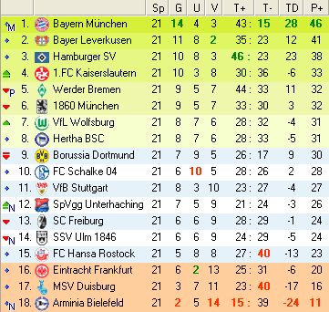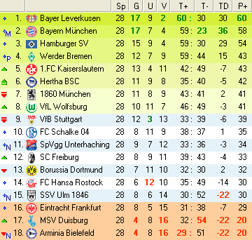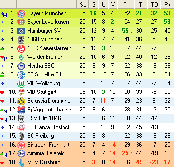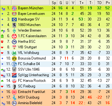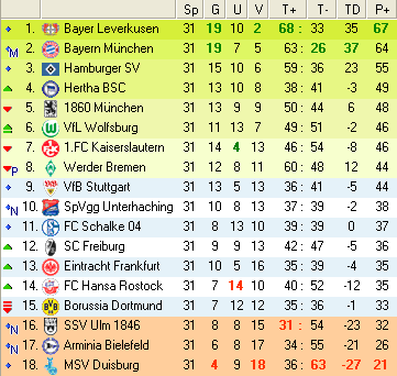 | 31. Spieltag | 5 | 1 | 3 | 24 | (14:10) | 2,67 | 0 | 1/1 | 30 | 0 | 1 | 281.553 | 31.284 | Tabelle |