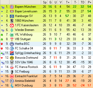 | 26. Spieltag | 4 | 4 | 1 | 24 | (14:10) | 2,67 | 1 | 2/3 | 43 | 1 | 2 | 266.159 | 29.573 | Tabelle |