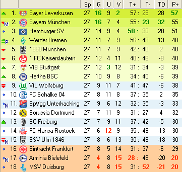 | 27. Spieltag | 3 | 2 | 4 | 27 | (12:15) | 3,00 | 0 | 3/4 | 50 | 2 | 1 | 305.359 | 33.929 | Tabelle |