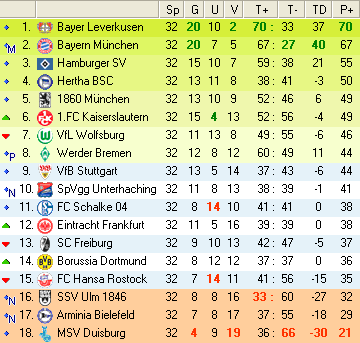 | 32. Spieltag | 4 | 2 | 3 | 30 | (18:12) | 3,33 | 1 | 0/2 | 36 | 3 | 1 | 337.208 | 37.468 | Tabelle |