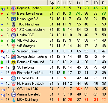 | 34. Spieltag | 4 | 3 | 2 | 27 | (14:13) | 3,00 | 2 | 1/2 | 33 | 1 | 0 | 347.580 | 38.620 | Tabelle |