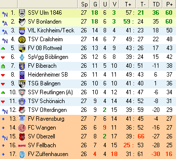 | 27. Spieltag | 4 | 1 | 3 | 26 | (12:14) | 3,25 | 3.490 | 436 | Tabelle |