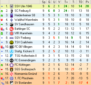 | 10. Spieltag | 5 | 0 | 4 | 42 | 25:17 | 4,67 | 1 | 1/2 | 47 | 3 | 5 | 7.780 | 864 | » Tabelle |