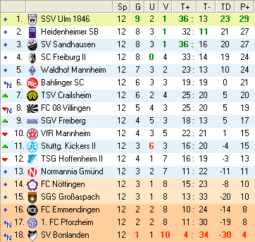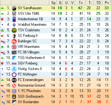 | 13. Spieltag | 5 | 1 | 3 | 24 | 15:9 | 2,67 | 0 | 3/4 | 44 | 2 | 2 | 11.650 | 1.294 | » Tabelle |