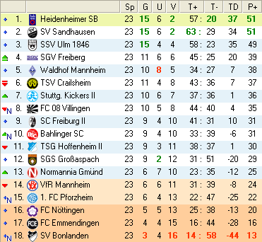 | 23. Spieltag | 3 | 2 | 4 | 29 | 14:15 | 3,22 | 1 | 4/4 | 31 | 2 | 1 | 7.930 | 881 | » Tabelle |